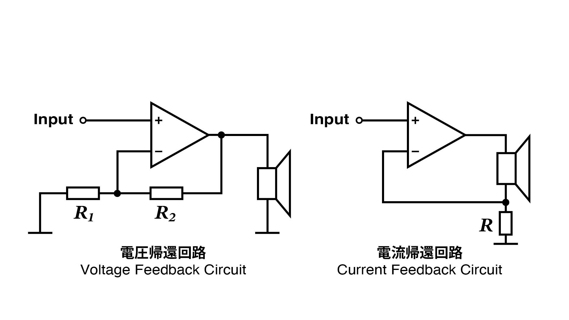 さらに、一歩踏み込んで電気回路的な解説を加えると、一般的な電圧駆動アンプ(Voltage Feedback Amp=電圧帰還増幅器)と電流駆動アンプ(Current Feedbak Amp=電流帰還増幅器)の基本的な増幅回路の設計は同一である。違いはフィードバック=帰還回路の接続先である。電圧帰還の場合には、帰還回路のインピーダンスが高い入力信号のマイナス側になるが、電流駆動の場合にはインピーダンスの低いバッファーの後段となる。このインピーダンスの違いにより、増幅回路の動作が電圧モード、電流モードの差異を生んでいる。