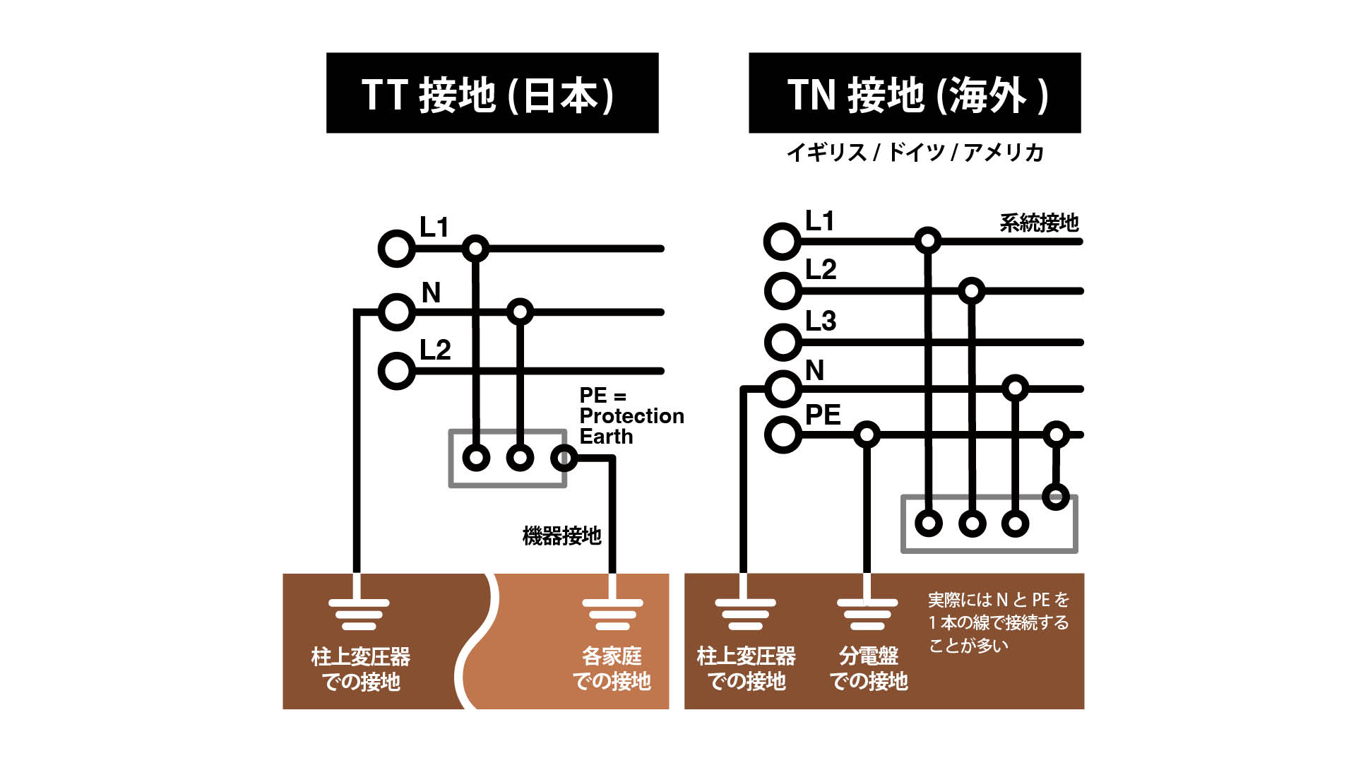 一方欧米では、供給電力の中性線とPE用のアース線はひとつの基準電位点に接続されており同一電位です。こちらは、TN方式と呼ばれる設置方式であり、雷サージや外部ノイズの影響に強いものです。TT接地の弱点は、別々のアース点を持つため、ここでの電位差が悪影響を及ぼす可能性があるという点。特に日本の電源供給方式では、100V負荷の偏りにより中性線に電位差が生じる可能性が高くなります。そのため、実際に設置しているPEとの間で電位差が生じる可能性も高いわけです。