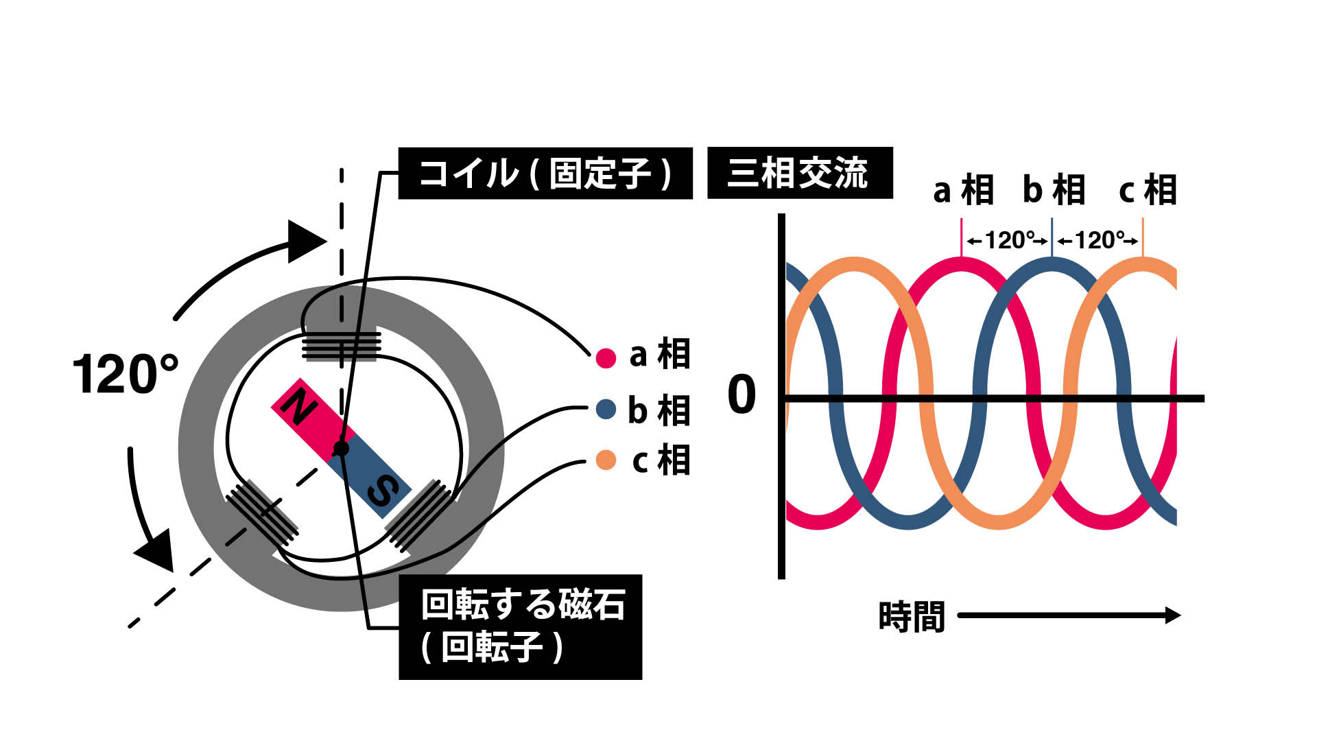 発電機の仕組みとしては、回転する磁石の周りに120度ずらした位置にコイルを配置することで三相電源を作ることができます。回転する磁石により電気が発生するということは、理科で習ったモーターと発電機の話を思い出してください。コイルと磁石の位置関係が120度ずれている=位相が120度ずれている波形が取り出せるということです。この発電方式は、世界中で周波数、出力電圧の違いはあれど、基本構造は全く同じです。発電された時点では、世界と日本の電気は同じであると言えるでしょう。