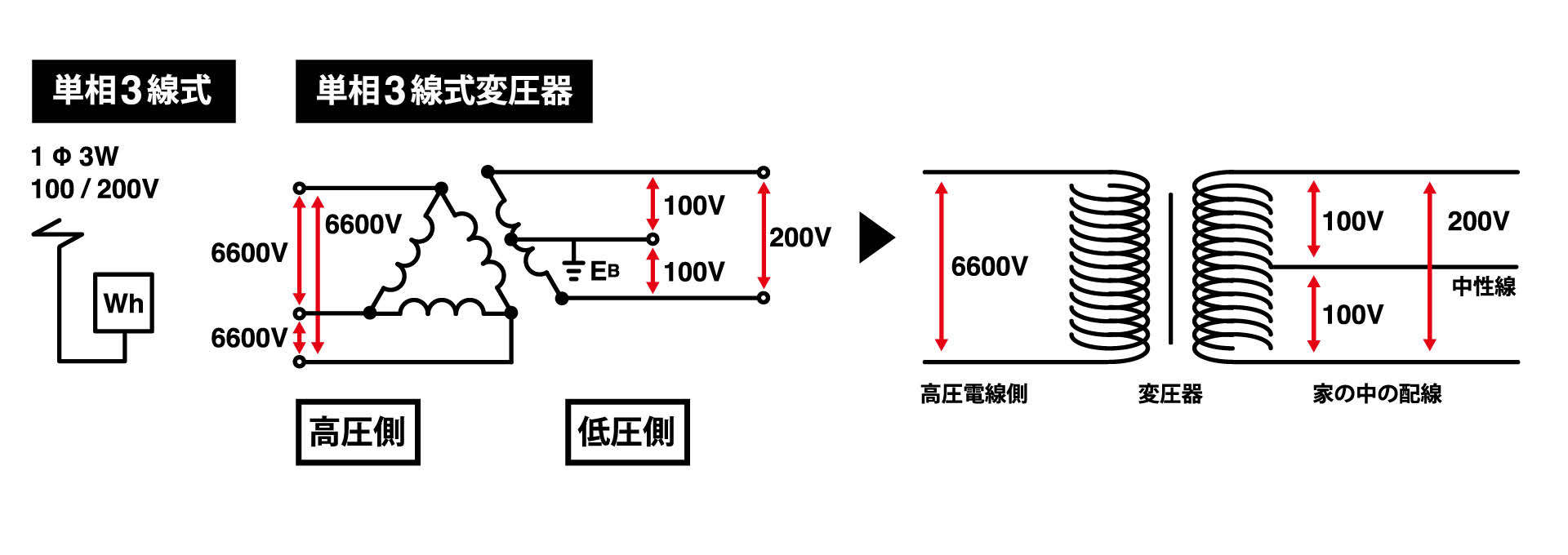 さぁ、ここからが本題です。世界と日本の電源供給における差異が生じるのは、この電柱を流れている三相6600Vが家庭用の単相電源へと変換されるところにあります。単相100Vとか、単相200Vなどという言葉は耳にしたことがあるかもしれません。これ自体は、供給される電源の波形の話であり、アメリカの単相120Vなどと意味として大きな違いはありません。しかし、その裏にはどのようにして三相交流から単相交流を取り出しているのか、我々の使用する音響機器にとって非常に大切なアースについてどのように考えられているのか、この部分に非常に大きな違いがあります。