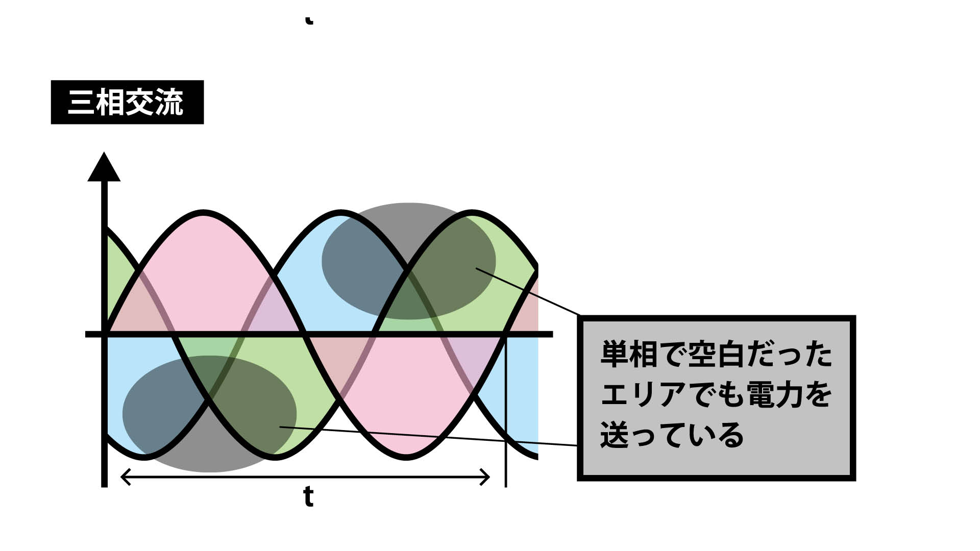 必ず3本の電線により送られている方式ということで、三相3線方式という名称の「3線」という部分は直感的に捉えられますが、そもそもなぜ3本なのでしょうか。電気は2本の電線があれば送ることができるのではないか、電気の基礎知識のある方であればそう考えるでしょう。これは名称の前半にある「三相」で送電しているというところがポイント、送電路で使われているのは交流ですので、正確には三相交流が送電されているということになります。辞書的な解説であれば、120度位相をずらした同一周波数の交流を3本の送電路のそれぞれ2本を使い3組の交流を送電する。ということになります。なるほど、全然わからないですよね。
