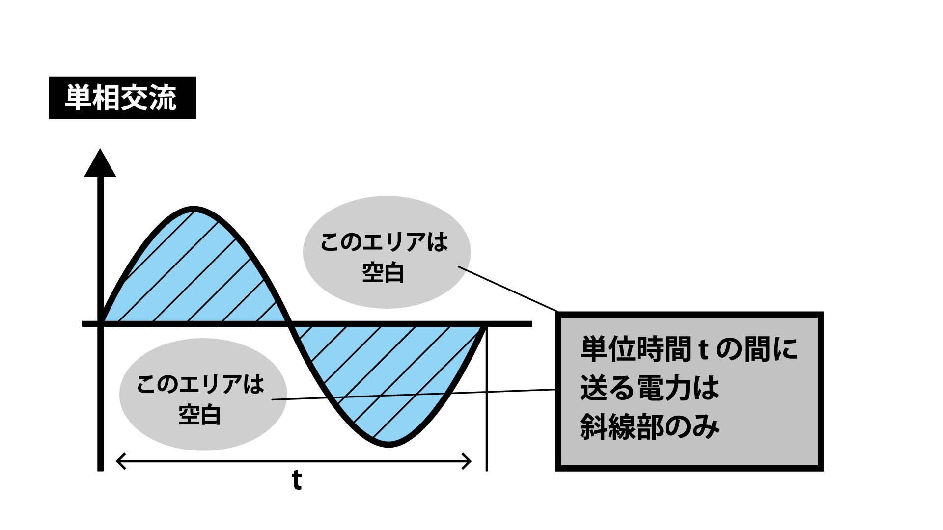 なぜ発電所で三相交流がその発電機の方式として使われているかというと、三相3線の送電方式の送電効率の良さという一点につきます。たった3本の電線で、3つの交流を送電できるこの方式は世界中で使われています。三相3線の送電路に接続される発電機であるため、もちろんその発電機も三相交流のほうが都合が良いということになります。細かい部分までは踏み込みませんが、図をご覧いただければ、三相3線の効率の良さがおわかりいただけるのではないでしょうか。世界中の電柱の電線が3本セットであるのはこんな理由があるのです。長距離を送電する高圧電線も同様に三相3線方式ですので、3本のセットを複数もうけて送電しています。