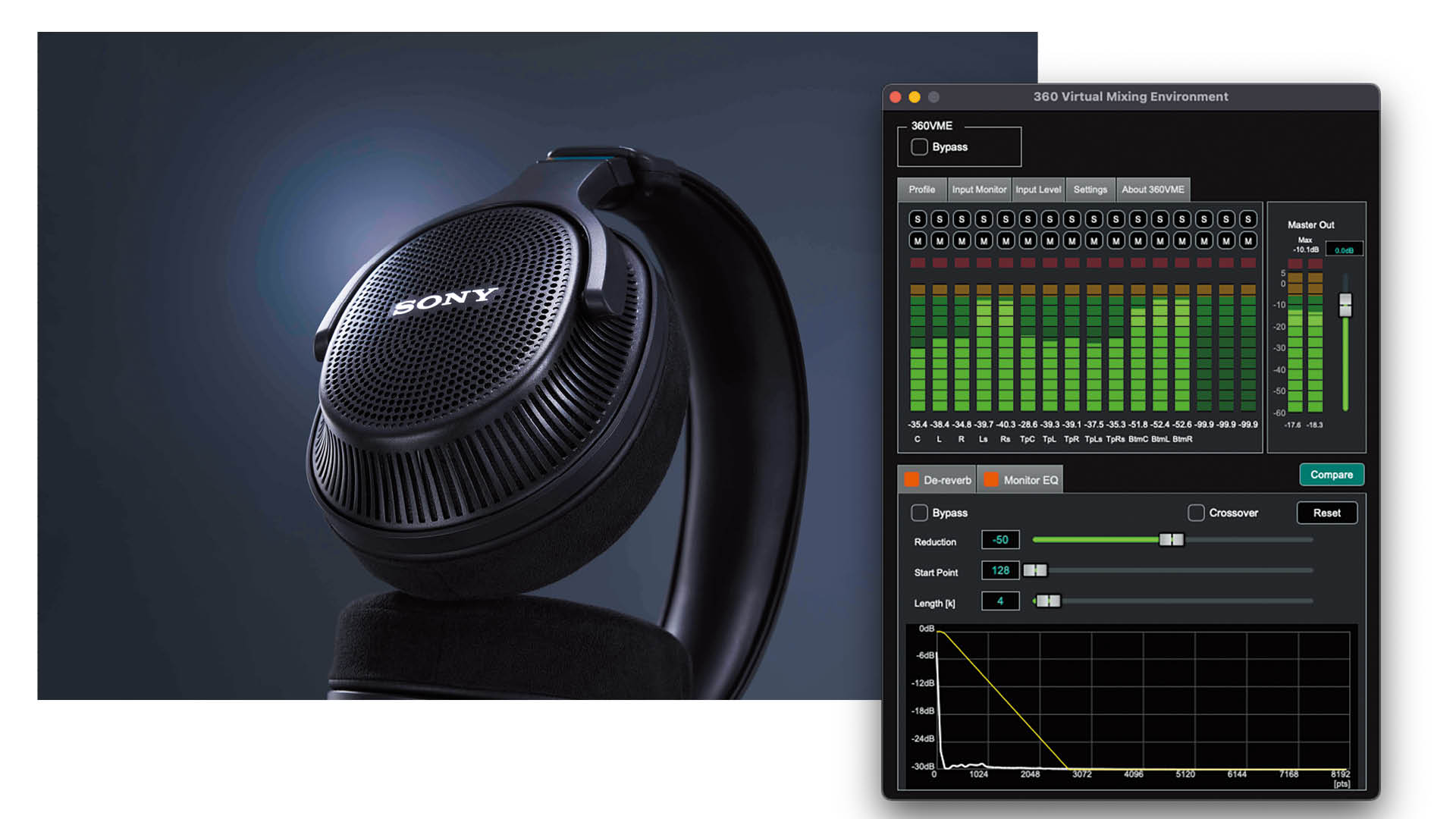 S:Sonyの日本の開発エンジニアたちとはまるで昔からの友達のような良いコミュニケーションが取れました。生産的で前向きなアイデアが次々と生まれ、バージョンを重ねるごとにEQのブラッシュアップや、RT-60(60dB減衰するまでの残響時間)のエンベロープやリリース・タイム、ディケイ・タイムを操作するデリバーブの機能など、たくさんのフィードバックが実現されてきたんですが、その中でも先ほど触れた測定に基いたルームアコースティックのシミュレーションはとても重要なポイントとなりました。スピーカーで囲まれている各々のスタジオで測定を行って、部屋が持つインパルス応答と個人が持つ耳のインパルス応答から空間を360VMEがシミュレートするわけですが、その360VMEプロファイルをかけた途端、いまは小さな空間にいるはずなのに、測定した時の大きな空間の音がするという驚きの体験が起きるんです。本当にニューヨークや東京にいても同じように感じることができますよ。やがては、もっと手軽なコンシューマー向けの製品でも実現されると個人的には嬉しいです。いま行っている測定というのもスイープ音を30秒ほど聴くだけですから、未来のオーディオショップに行くとスキャンができて、360VMEのヘッドホンかイヤホンかを耳にかけると、そのヘッドホンに突然魔法がかかってしまうという…作品の作り手側もそんな世界を期待してしまいます。