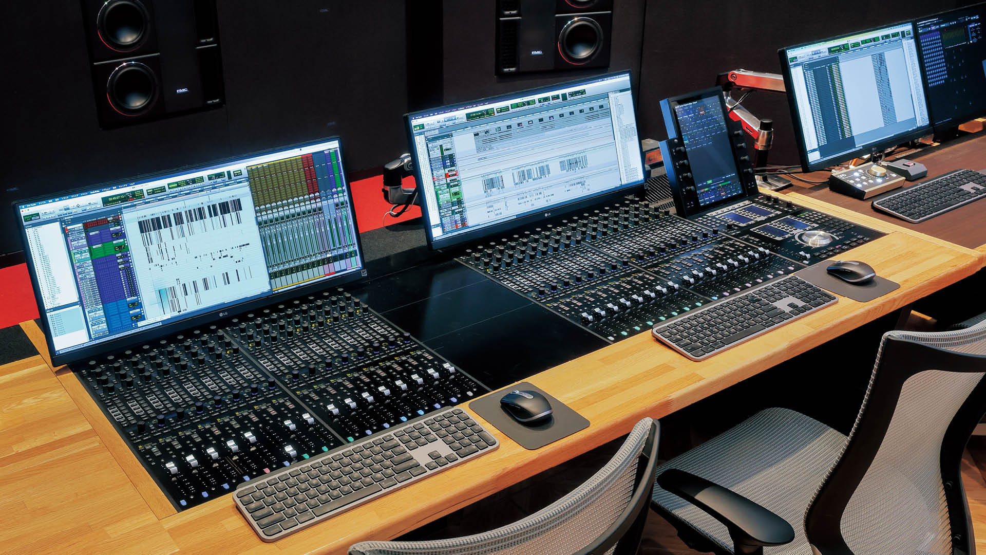 この部屋のシステムは、Avid S6をフラットに埋め込んだ机を中心とし、4台のPro ToolsとDobly Atmos Rendererが動作するRMU、計5台のPCにより構成されている。映画スタジオらしくダビングのシステムをコンパクトにした設計で、プレイアウトとしてのPro Toolsが3台、ダバーが1台という構成である。すべてのPro Toolsは1台のAvid MTRX IIへDigiLinkで接続され、コンパクトな設計ながら柔軟性のあるシステムアップを実現している。RMUはDanteによる接続だ。出力は、MTRX IIからのMADI出力をRME ADI-6432でAESに変換。そのAES信号をRME ADI-8 QSでアナログ信号へ変換してスピーカーへ接続している。他の映画会社でも採用されているこのシステムだが、RMEのSteady Clockによるデジタル信号のジッタ抑制技術を組み込み音質に対しての最大限のトリートメントを行うためにこのような機器選定となっている。